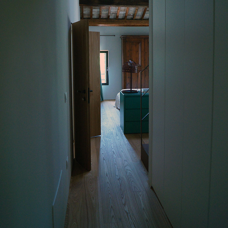 In entrambi i casi, dettagli ricercati si alternano ad una raffinata sobrietà. Materiali d’eccezione ma naturali, come la calce e il cocciopesto, il vetro di Murano e l’essenza di rovere spazzolata giocano al contrasto che diventa il filo conduttore di questa meravigliosa casa di campagna in cui, volutamente, sono stati creati ambienti armonici ma che "osano".
