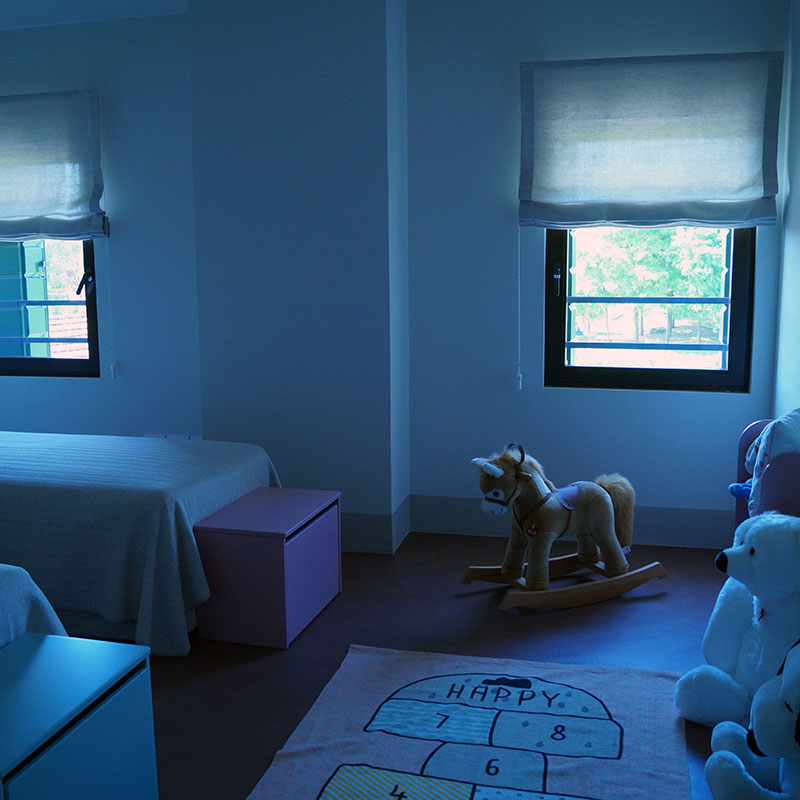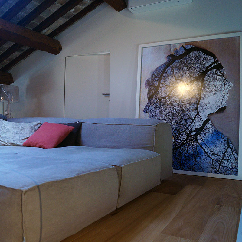 Ne sono un esempio l’atrio d’ingresso in terrazzo veneziano, il living, la sala del caminetto, le camere da letto e i bagni in pastellone veneziano, la cui continuità vibra sotto il tocco della luce.